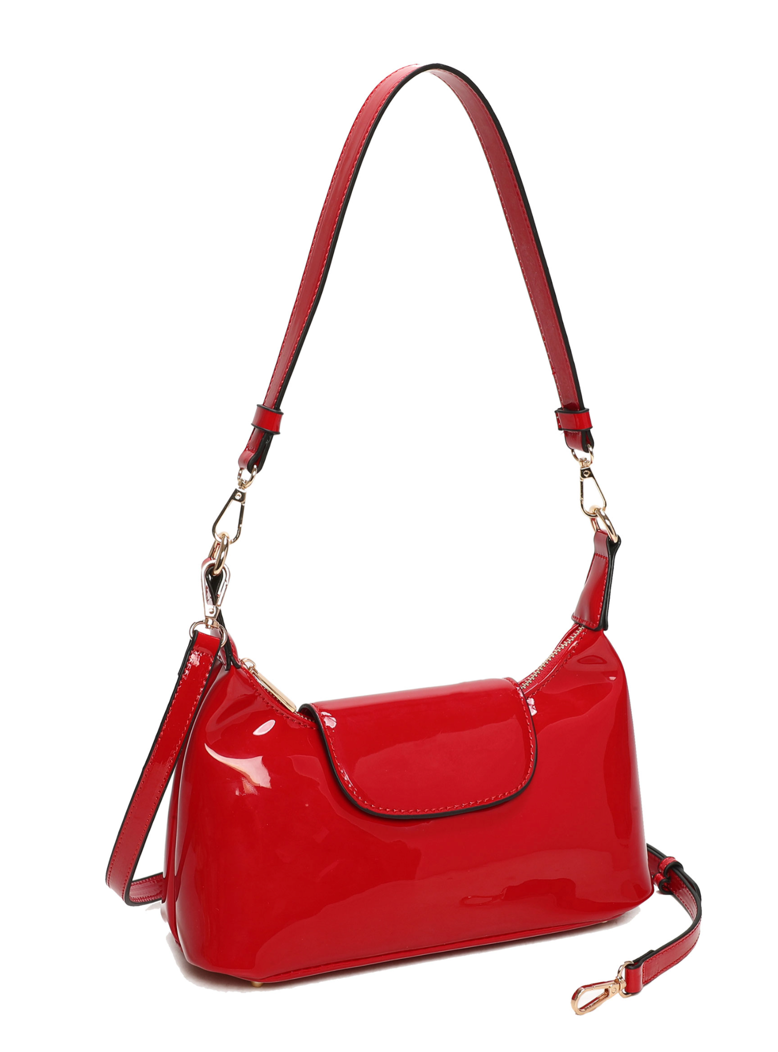 Bolso bandolera de charol sintético con solapa superior y cierre magnético metálico. Asa de hombro extraíble. Detalle correa larga adicional ajustable y extraíble.