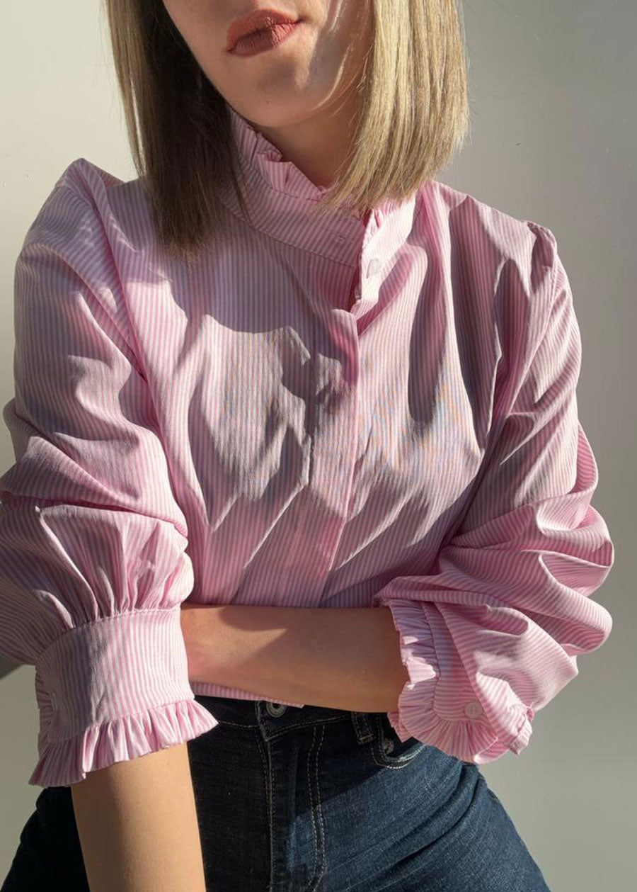 Camisa de rayas de manga larga. El cuello perkins es rizado y los puños son ajustados con un pequeño ribete y dos botones, el género es muy dulce y con un toque de licra. Talla única.