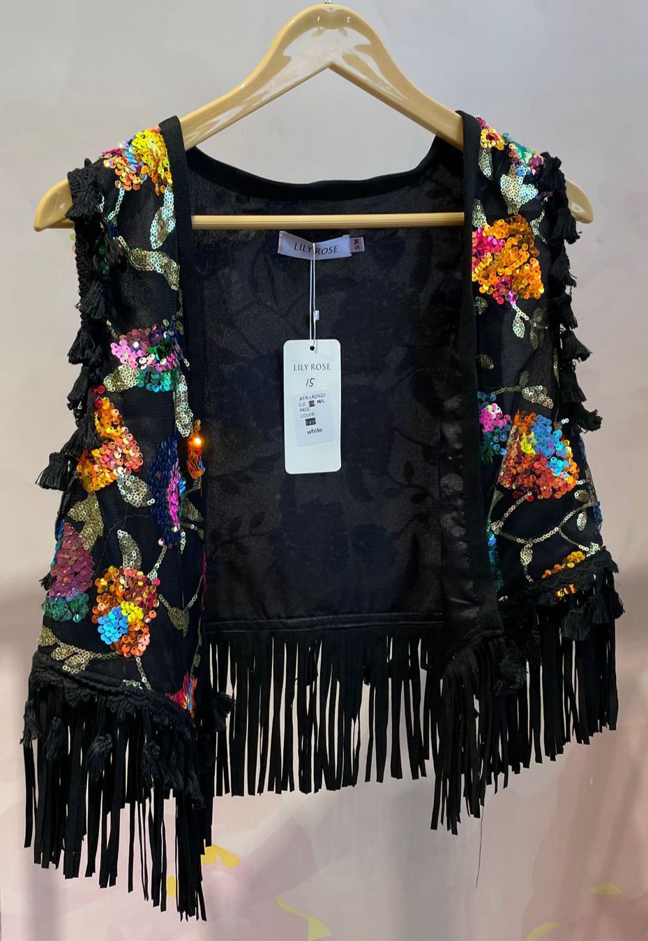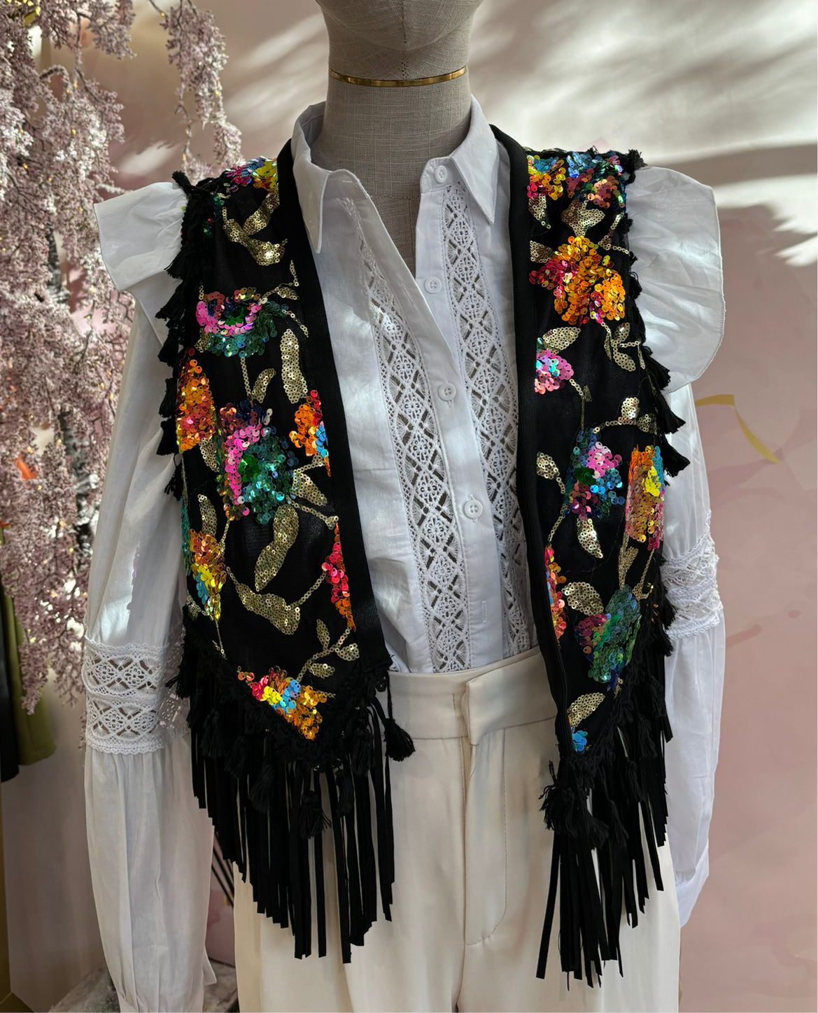 El Chaleco Cocktail Caipirinha dará un toque de personalidad a todos tus looks, un toque chic gracias al tejido de lentejuelas multicolor y un lado boho con los flecos de antelina. Una pieza diferente perfecta para vivir un verano increíble. Combínalo con prendas de un sólo color para hacerlo destacar.