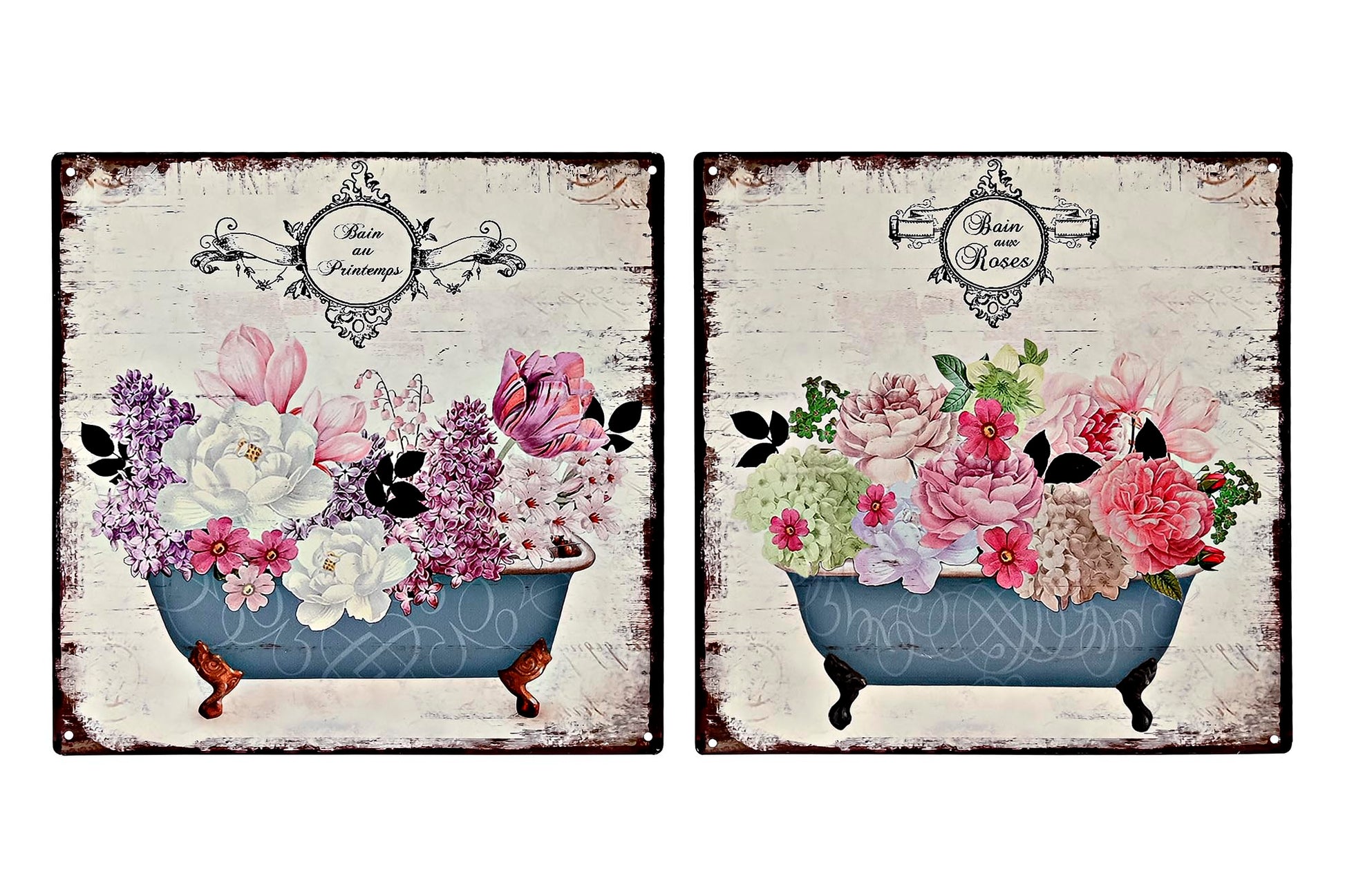 Preciosa placa decorativa en metal con una bañera floral.