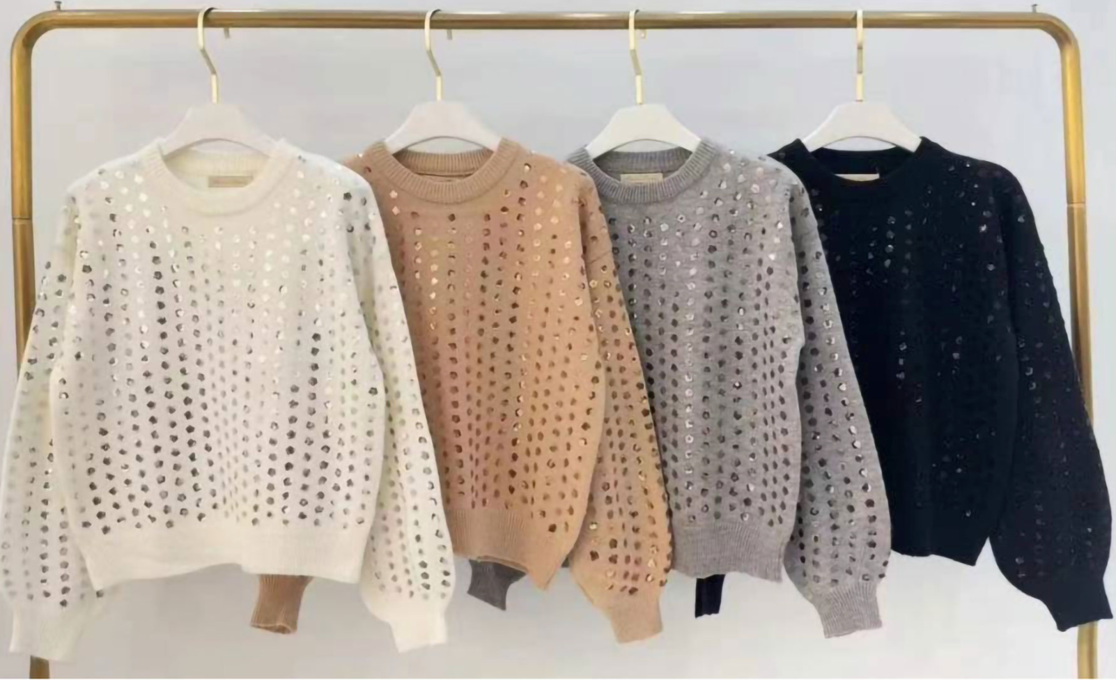 Jersey lentejuelas. Punto soft. Acabados en rib. Cuello redondo. Manga larga.