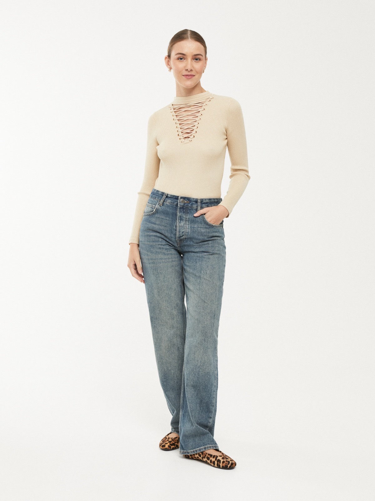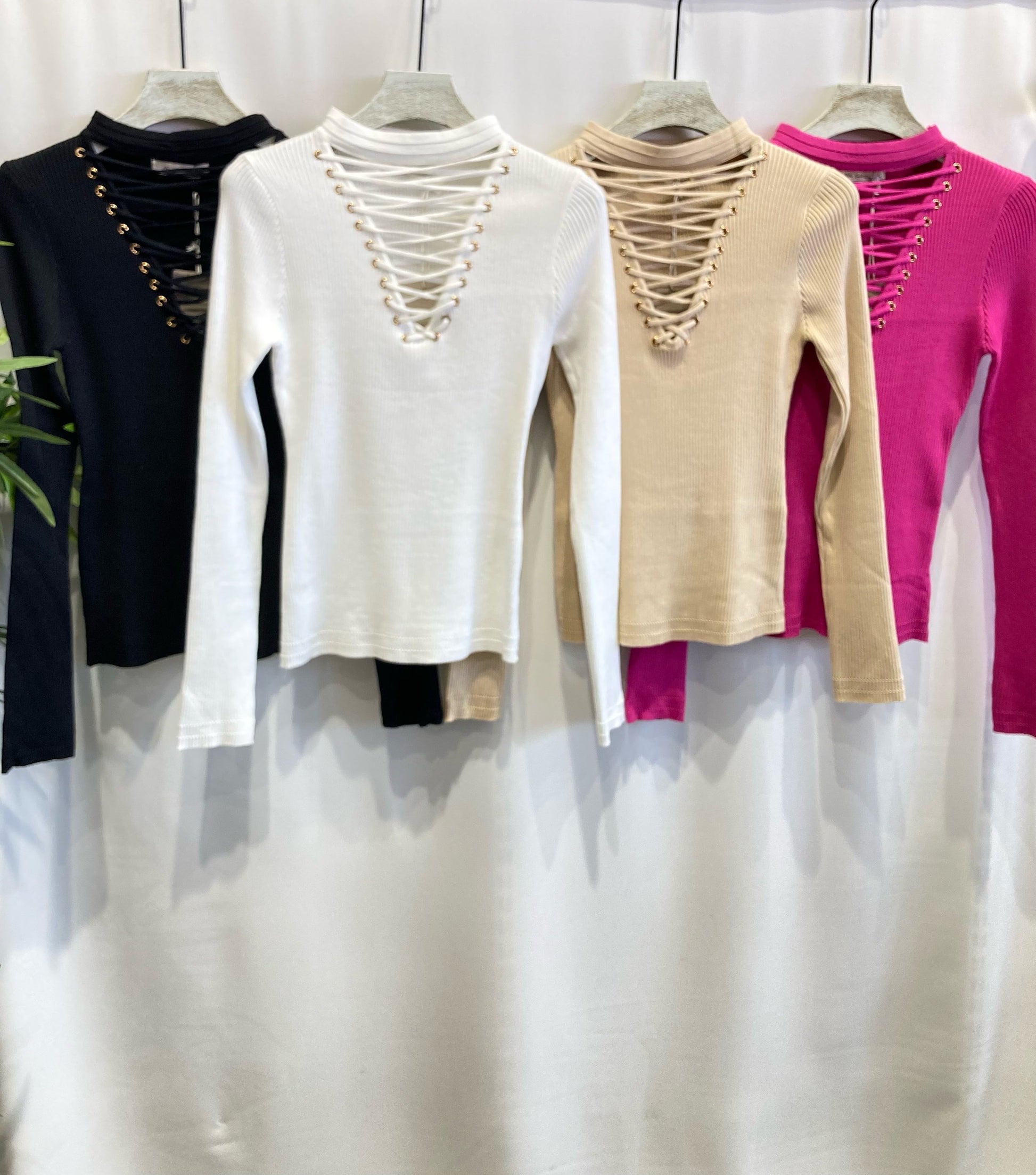 El suéter de punto elástico acanalado con cordones Maje en viscosa blanca ofrece un toque contemporáneo a un diseño clásico.. La parte superior acanalada proporciona un ajuste favorecedor y un uso cómodo., mientras que el escote en V añade un toque de feminidad. Con su llamativo detalle de ojales y su escote con cordones, Este suéter combina sin esfuerzo elementos elegantes y atrevidos para una apariencia única y elegante.. Elaborado con una mezcla de viscosa de alta calidad., garantiza comodidad y durabilidad. Esta pieza versátil se puede vestir formal o informal., por lo que es un complemento imprescindible para cualquier guardarropa de moda.