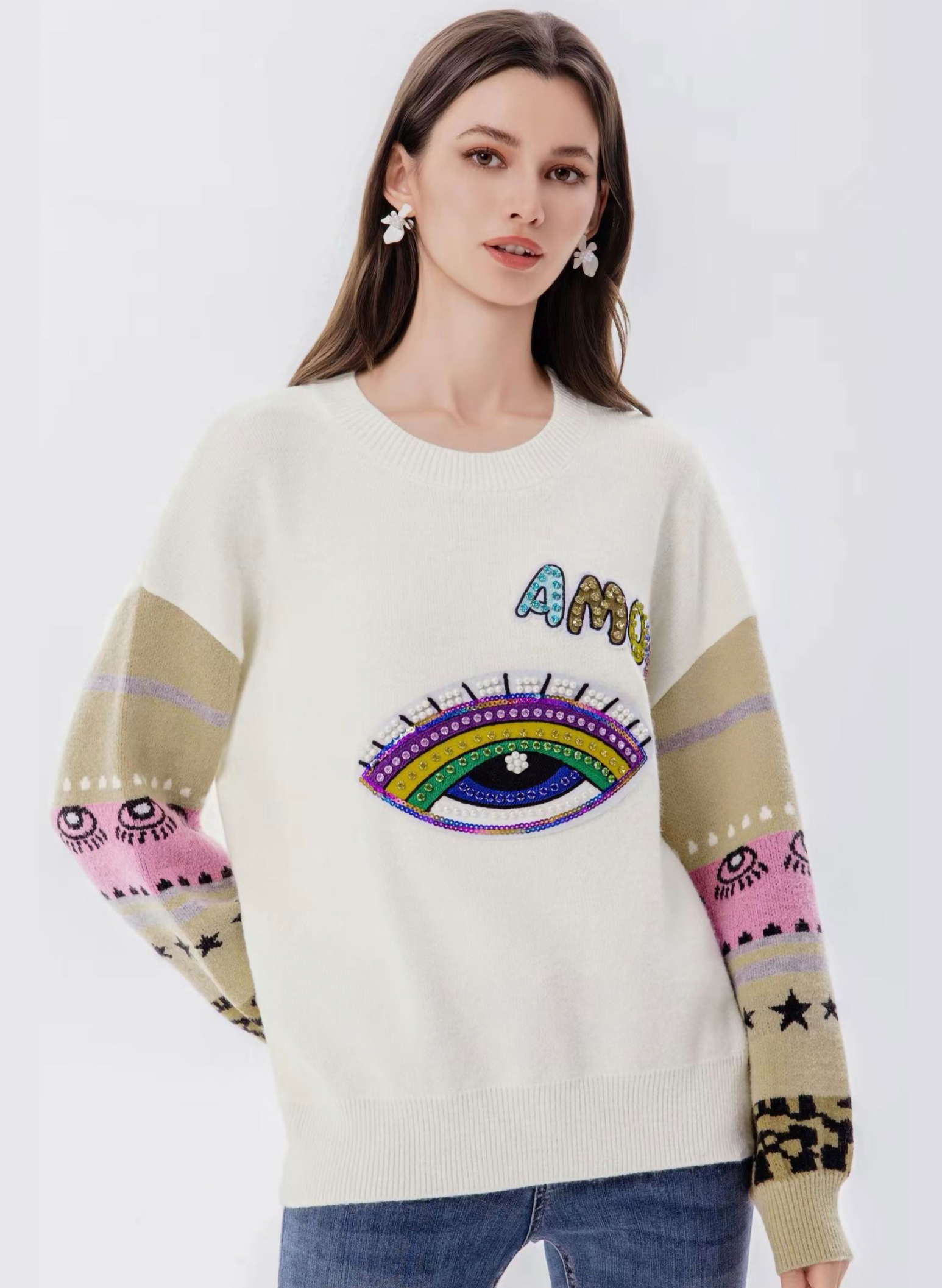 Jersey de punto. Detalle aplicaciones. Cuello redondo. Manga larga .