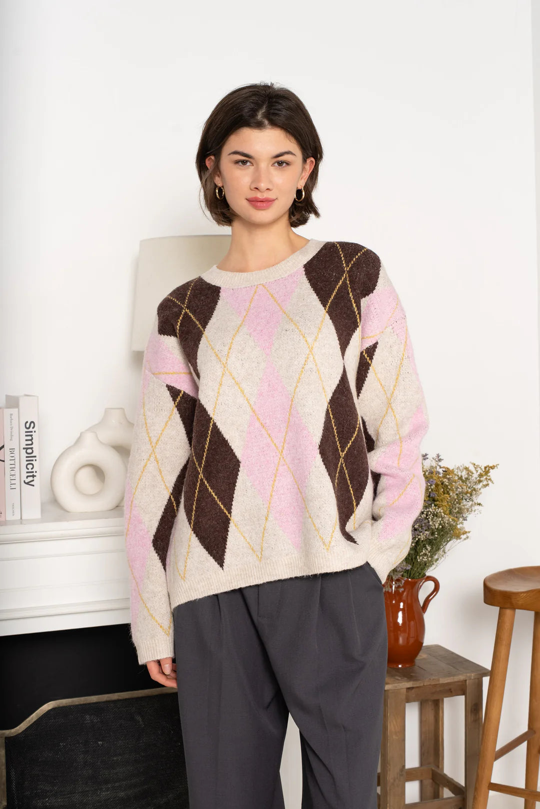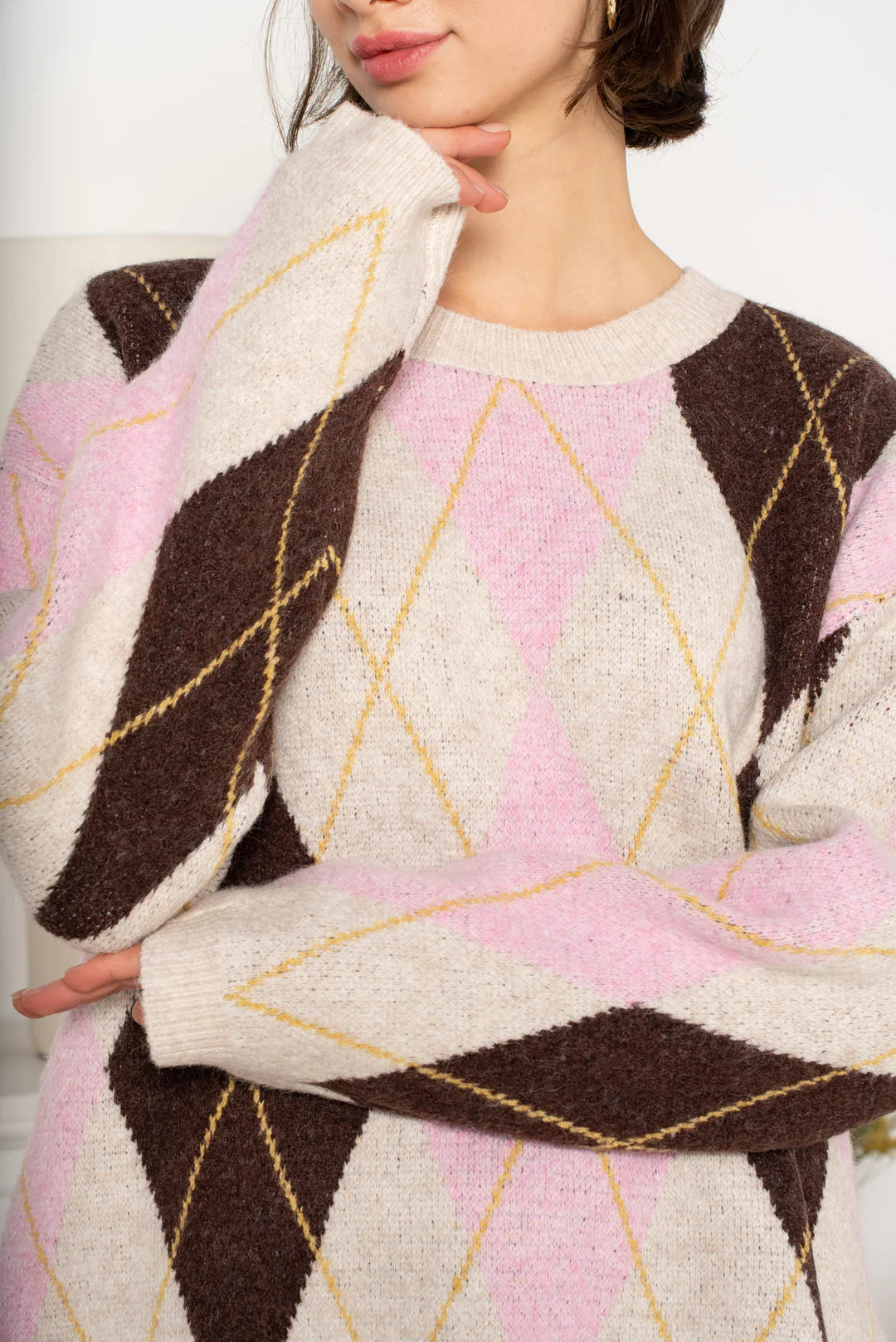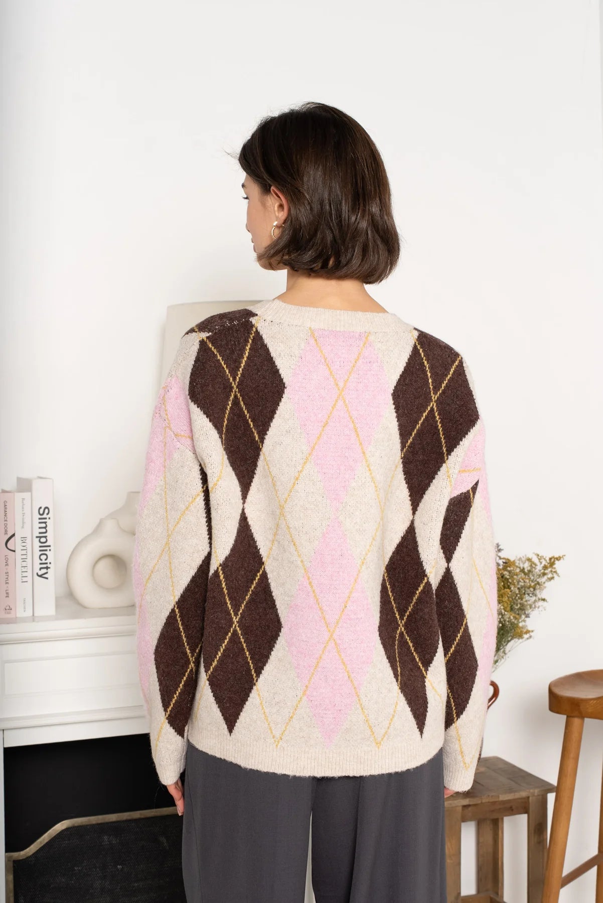 El jersey de punto de rombos Alba es un clásico acogedor con un toque moderno. Con un suave estampado de rombos en tonos café y rosa, este jersey es perfecto para añadir calidez y estilo a tu armario de diario.