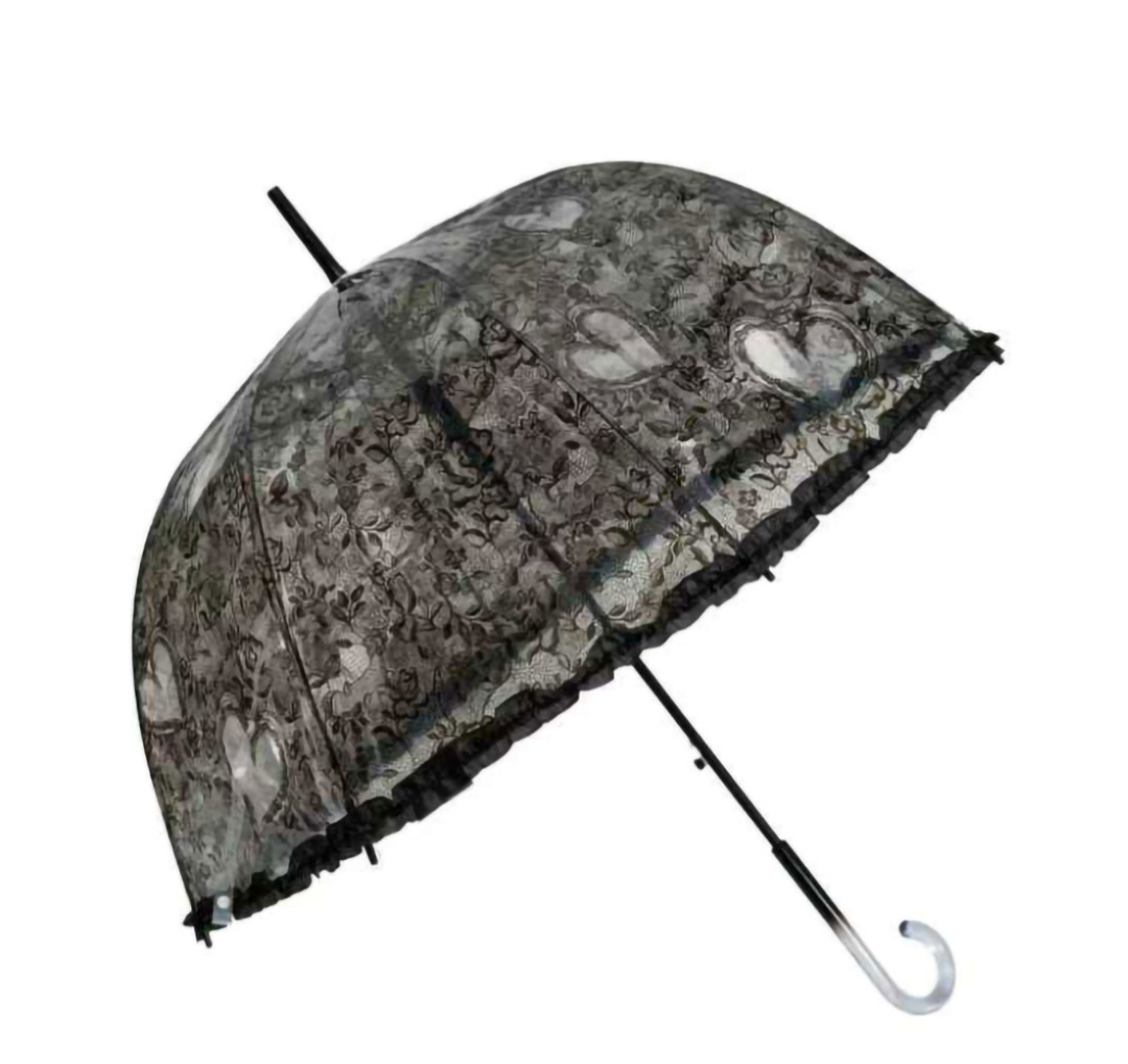 Paraguas largo automático con 8 varillas de fibra y estructura de fibra. Lámina plástica transparente con motivo de encaje y volante perimetral. Sistema antiviento y mango plástico.