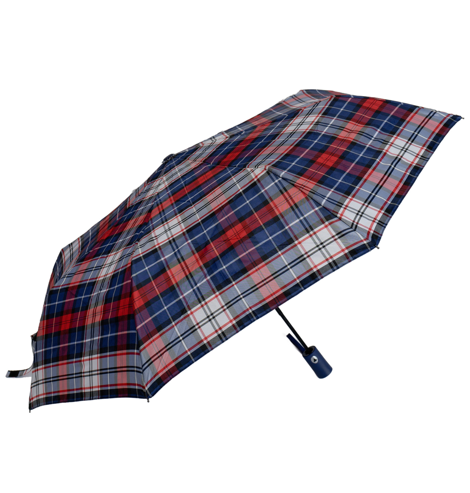 Paraguas plegable cuadros. Tela PG. Antiviento. Automático. 8 Varillas de fibra. Mango de goma. Estructura de metal. 3 secciones. Colores surtidos.