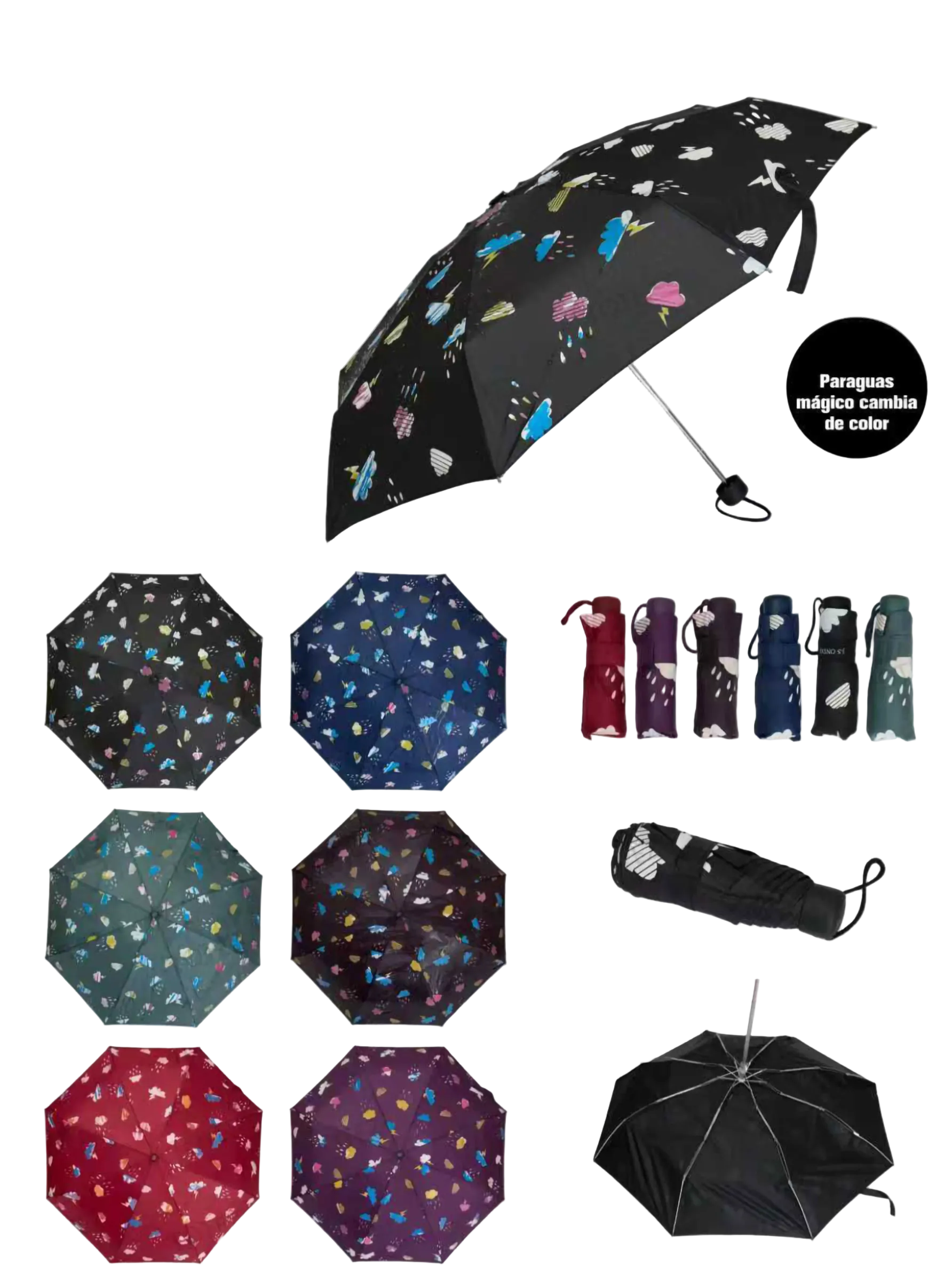 Paraguas plegable de 5 secciones con nubes y gotas que cambian de color al mojarse. Sistema antiviento. Varillas de aluminio y fibra. Mango de goma.