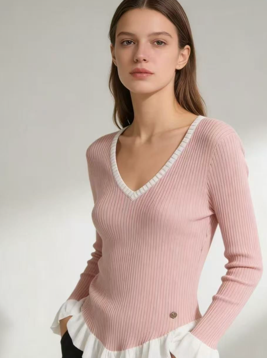 Suéter confeccionado en tejido de punto acanalado. Diseño con cuello en pico y detalle en contraste que aporta un toque elegante. Manga larga con acabado ligeramente acampanado en el puño y bajo con efecto ondulado.