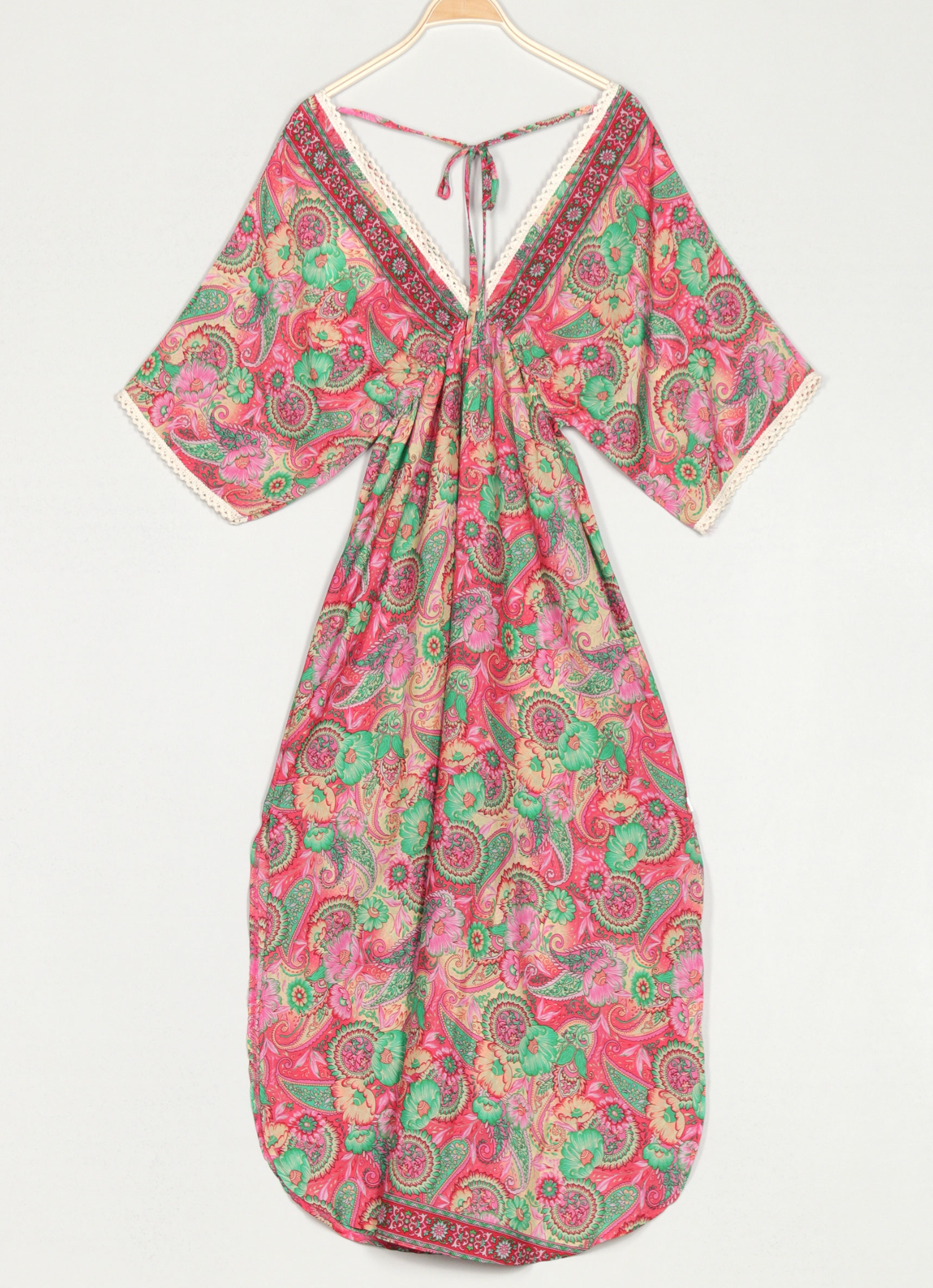 Vestido largo estampado. Detalle puntillas. Frunce cintura. Bajo con abertura laterales. Cuello pico. Manga murciélago.