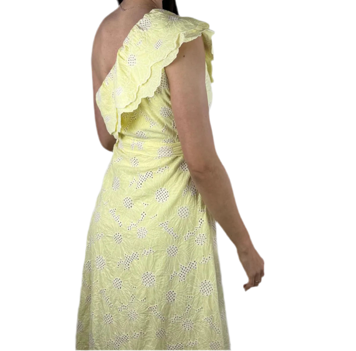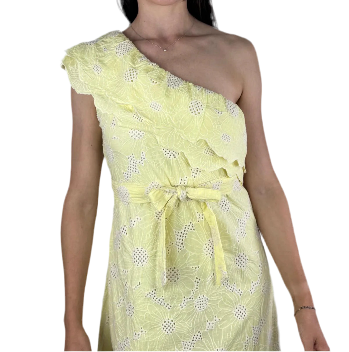 El escote asimétrico con hombro al aire y los dos volantes bordados aportan ese toque femenino y sofisticado que enamora a primera vista. Además, incluye un cinturón del mismo estampado y bordado, ideal para estilizar la figura y dar un aire más pulido al look. Su forro completo garantiza comodidad y opacidad, lo que lo convierte en una opción perfecta tanto para eventos especiales como para el día a día más chic.
