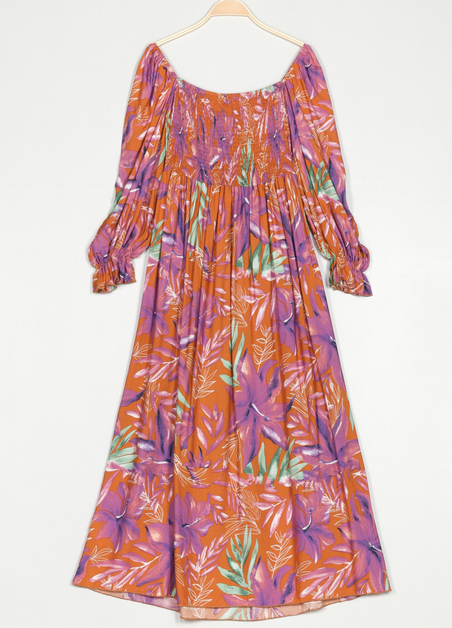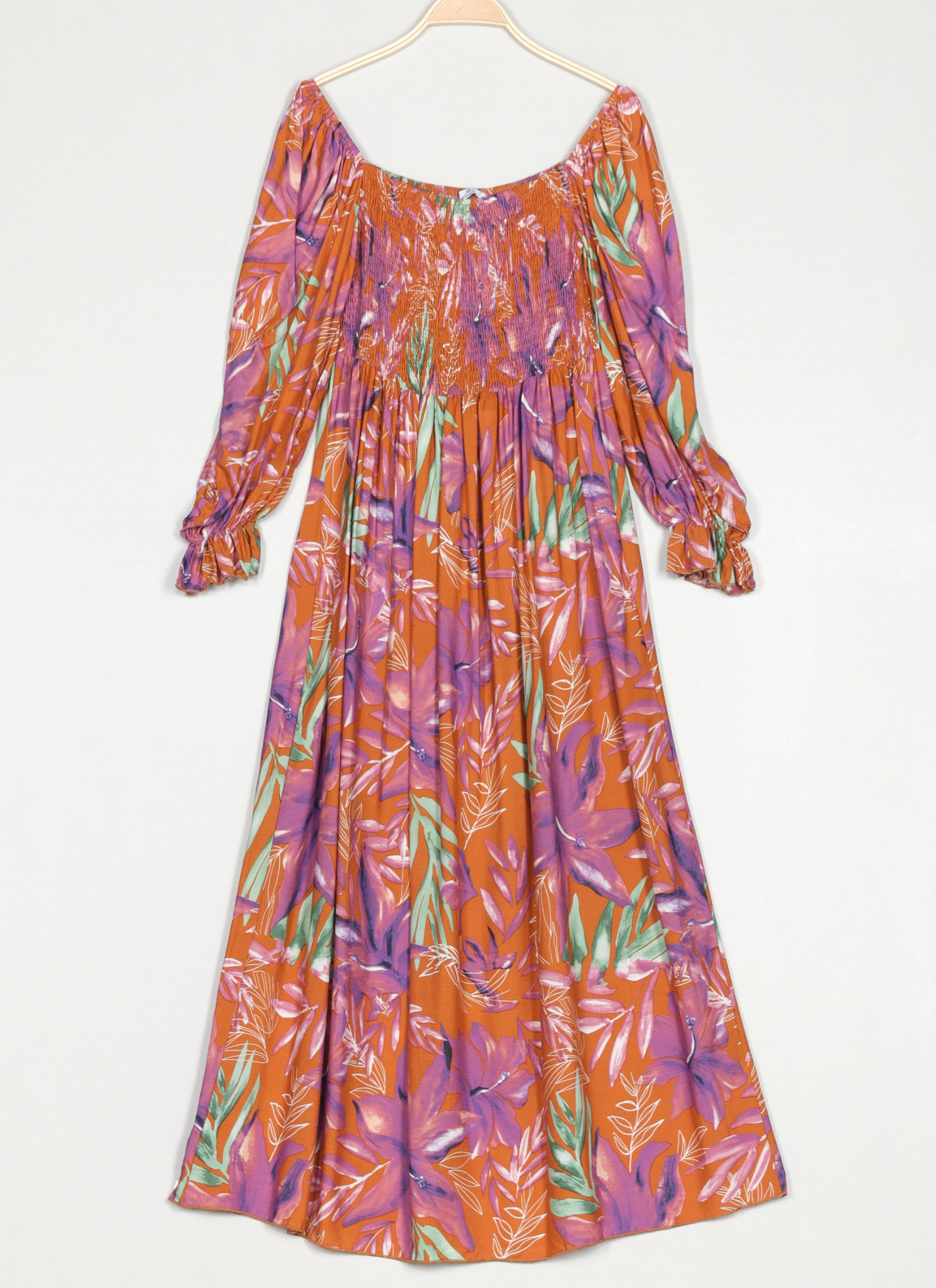 Vestido largo estampado con vuelo. Detalle de frunces en pecho. Manga larga.